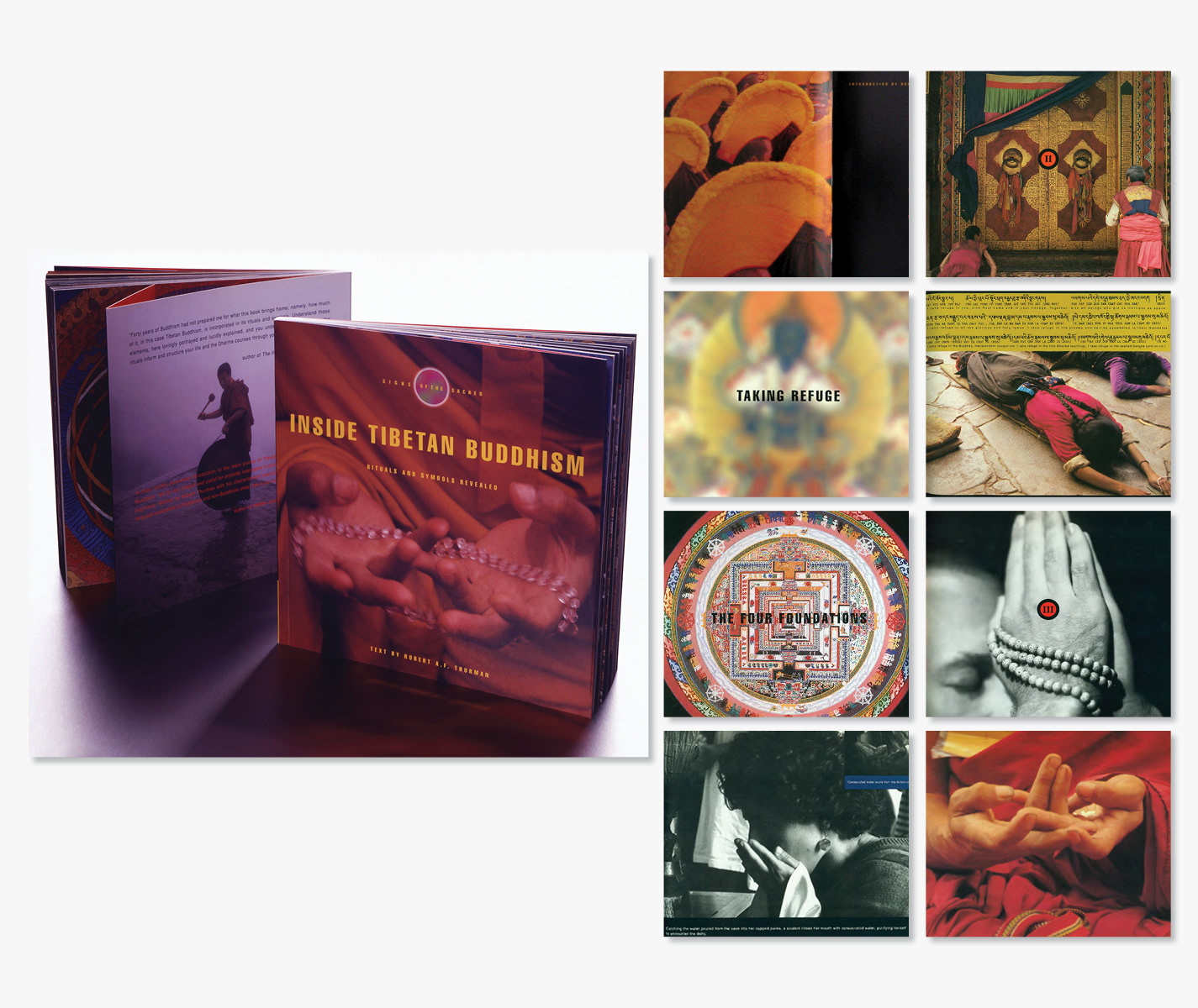 Design direction for motorcycle history book. Front/back cover spread and inside page spread. Inside Tibetan Buddhism Book: Book by Robert Thurman for Harper Collins.
